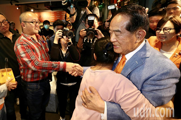 宋楚瑜(右二)與副手人選余湘(右一)在晚上在競(jìng)選總部發(fā)表感想。隨后離開(kāi)總部時(shí)一一向支持者握手、擁抱謝票。(圖片來(lái)源:臺(tái)灣《聯(lián)合報(bào)》)