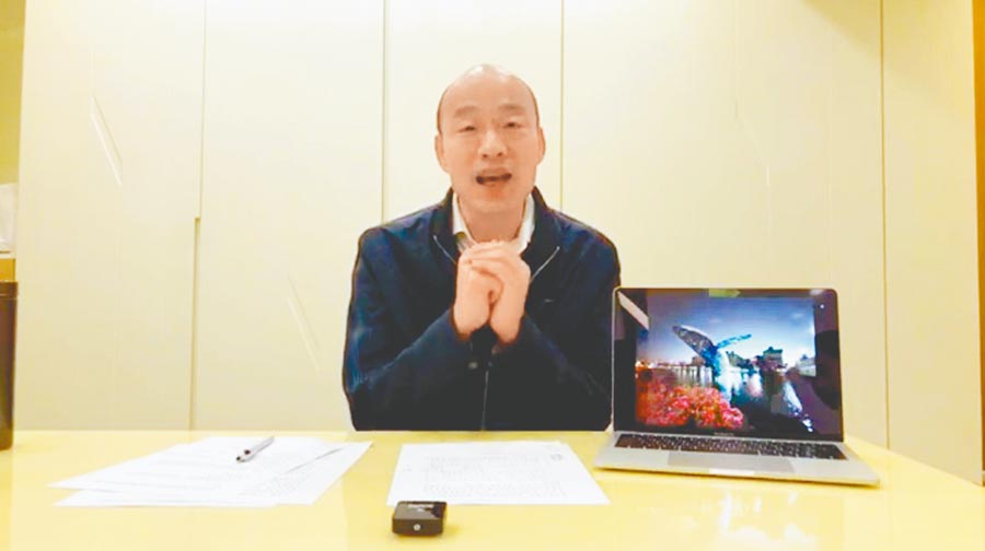 高雄市長(zhǎng)韓國(guó)瑜選后首度開直播,18日傍晚在臉譜網(wǎng)拜早年,呼吁臺(tái)灣社會(huì)恢復(fù)和諧。(圖片來(lái)源:臺(tái)灣“中時(shí)電子報(bào)”)
