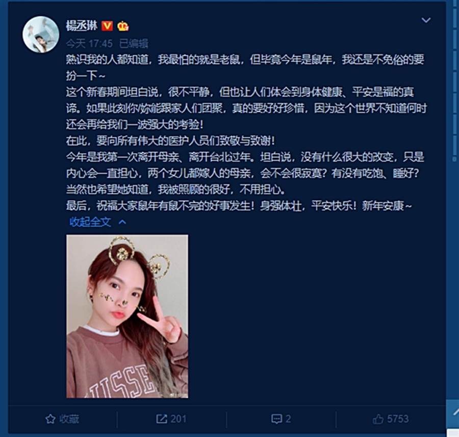 楊丞琳發(fā)文。(微博截圖)