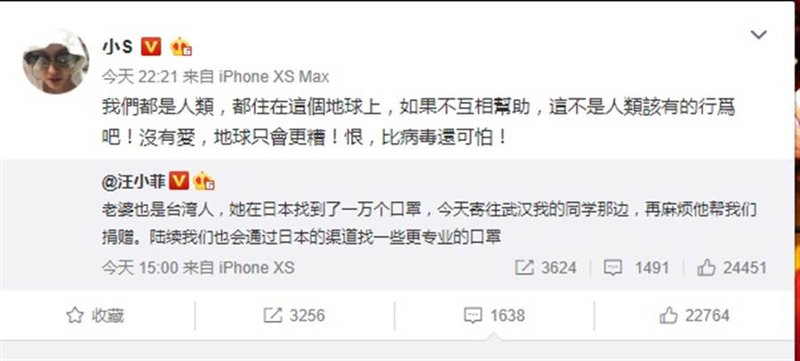 中國臺(tái)灣網(wǎng)1月28日訊 新型冠狀病毒感染的肺炎肆虐,引爆口罩搶購潮,汪小菲27日在微博透露老婆大S在日本找到1萬個(gè)口罩,今天已寄往武漢請(qǐng)人幫忙捐贈(zèng),令網(wǎng)友感動(dòng)不已。深夜小S也在微博轉(zhuǎn)發(fā)姐夫的文章,直指若不互相幫助,不是人類該有行為吧,一連3個(gè)驚嘆號(hào),讓人隔著屏幕都可感受到小S的怒氣。