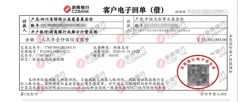 新希望集團(tuán)捐贈1500萬元現(xiàn)金回單(中國臺灣網(wǎng)發(fā))
