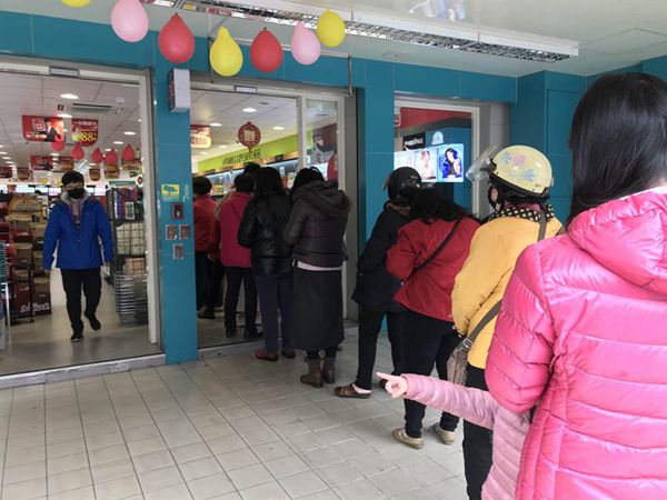宜蘭市某連鎖藥妝店涌入大量搶購口罩的民眾,排成的隊(duì)伍從店內(nèi)拉到店外的馬路上。(圖片來源:臺(tái)灣“中時(shí)電子報(bào)”)