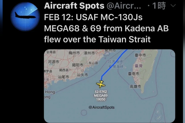 中國臺灣網(wǎng)2月12日訊 據(jù)臺灣“聯(lián)合新聞網(wǎng)”報道,美國社交媒體賬號”飛機守望”12日披露,美國空軍兩架編號MEGA68、MEGA6869的MC-130J特戰(zhàn)運輸機,今天中午沿臺灣海峽中線,由北向南飛行,穿越臺灣海峽上空。根據(jù)該社交媒體賬號披露的航跡,未交待兩機最后去向,但根據(jù)過去慣例,通常是飛返嘉手納基地。