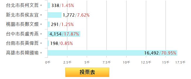 截至28日早上8點(diǎn)47分許,共計(jì)有23245票,民進(jìn)黨籍桃園市長鄭文燦只獲得291票,僅占1.25%;民進(jìn)黨籍臺南市長黃偉哲獲得198票,占總票數(shù)0.85%;無黨籍臺北市長柯文哲拿到338票,占總票數(shù)1.45%。國民黨籍臺中市長盧秀燕獲得4154票,占總票數(shù)17.87%;國民黨籍高雄市長韓國瑜拿下16492票,高達(dá)總票數(shù)70.95%,新北市張侯友宜拿下1772票,占總票數(shù)7.62%。(中國臺灣網(wǎng) 李寧)
