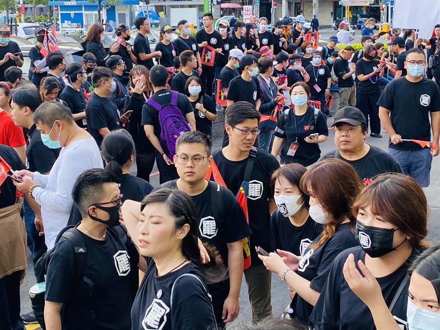 罷韓團體上百人共同護送連署書至高雄市選委會,許多參與人員未戴口罩。 (圖片來源:臺灣“中時電子報”)