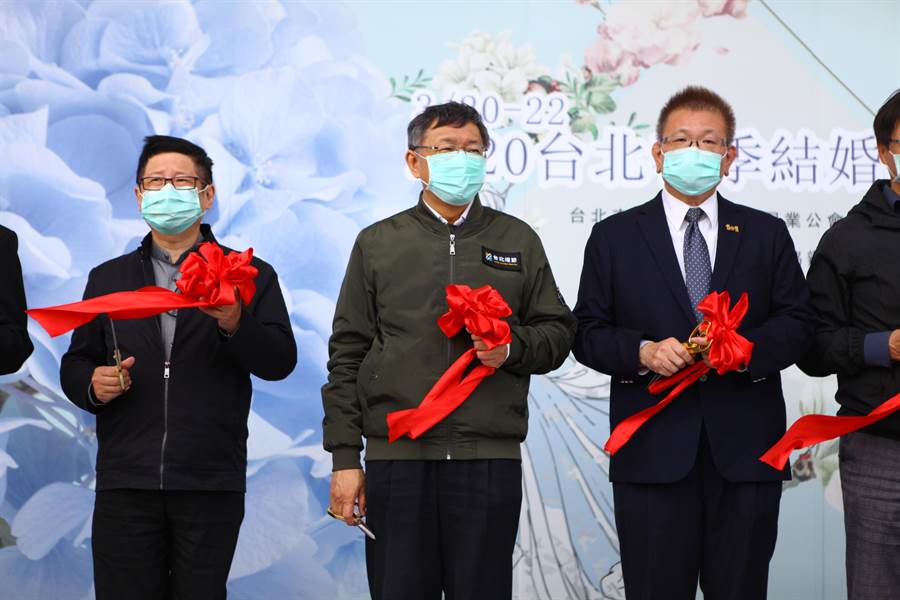 臺北市長柯文哲(左二)20日參加結(jié)婚購物節(jié)。(圖片來源:臺灣“中時電子報”)