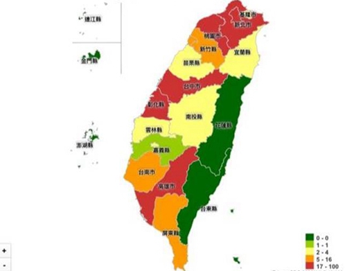 根據(jù)臺“疾管署”確診地圖顯示,臺北市確診達100例最多、新北市82例、桃園市35例、臺中市34例、高雄市27例、彰化縣17例、臺南市13例、新竹市9例、屏東縣7例、新竹縣6例、云林縣4例,基隆市、嘉義市、苗栗縣各3例,宜蘭縣、南投縣則是各2例,嘉義縣1例。