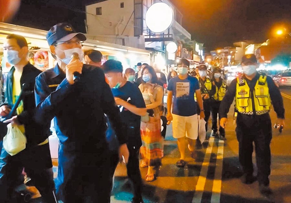 對于墾丁街上人潮摩肩擦踵,警方在大街上兵分兩路,步行及開著巡邏車沿街廣播,提醒民眾“保持社交距離”。(中國臺灣網(wǎng) 李寧)