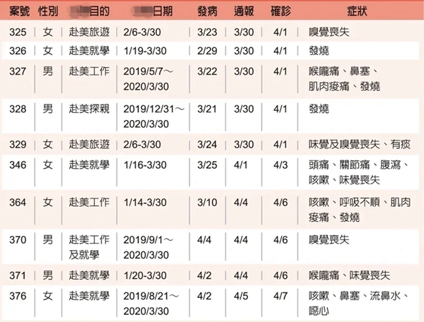 臺(tái)灣地區(qū)流行疫情指揮中心指揮官陳時(shí)中表示,案376于4月2日至5日陸續(xù)出現(xiàn)咳嗽、鼻塞、流鼻水及惡心癥狀,由衛(wèi)生單位安排就醫(yī)采檢,于今日確診。案376為案370的友人,于美國(guó)就學(xué),3月30日與案370、371一同返臺(tái),居家檢疫期間因返臺(tái)搭乘的班機(jī)上有其他旅客確診,因此改列為居家隔離接觸者。