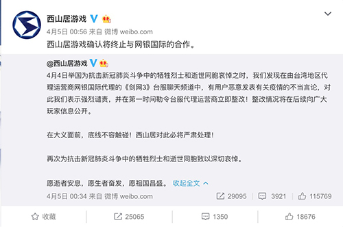 豈料,消息傳出后,引發(fā)臺灣地區(qū)部分玩家不滿。3日晚間,部分臺灣地區(qū)玩家在《劍網(wǎng)3》臺服聊天頻道內(nèi)發(fā)布多條有關(guān)疫情不當言論,甚至以污名化的“武漢肺炎”刷屏。對此,西山居游戲第一時間在官方微博發(fā)布聲明,勒令臺服代理運營商立即整改。在遭到臺服代理運營商的拖延和拒絕后,西山居游戲隨后又補發(fā)聲明“確認將終止與網(wǎng)銀國際的合作”。