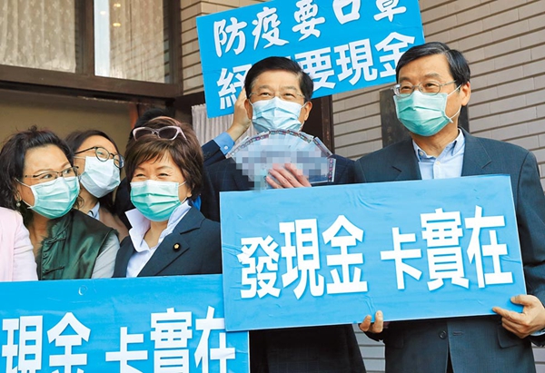 民調(diào)顯示,83%的民眾贊成發(fā)現(xiàn)金或消費(fèi)券。圖為臺(tái)“立院”國(guó)民黨團(tuán)4月10日發(fā)表“發(fā)現(xiàn)金給口罩”主張,要求民進(jìn)黨當(dāng)局發(fā)放紓困現(xiàn)金。(圖片來源:臺(tái)灣“中時(shí)電子報(bào)”)