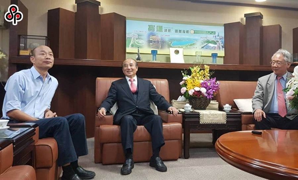 高雄市農(nóng)會(huì)理事長(zhǎng)蕭漢俊(右)表示,臺(tái)灣前“立法院長(zhǎng)”王金平(中)認(rèn)為民進(jìn)黨傾全力“罷韓”,身為國(guó)民黨員,王會(huì)在適當(dāng)時(shí)講適當(dāng)?shù)脑,表態(tài)支持韓國(guó)瑜(左)。(圖片來源:臺(tái)灣“中時(shí)電子報(bào)”)