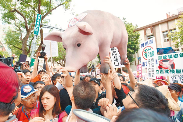 圖為臺灣民眾此前在臺“立院”外抗議瘦肉精美豬進口。(圖片來源:臺灣“中時電子報”)