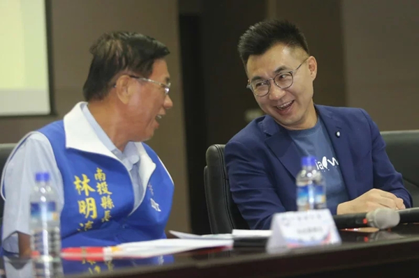 國(guó)民黨行動(dòng)中常會(huì)昨天在南投舉行,黨主席江啟臣(右)與南投縣長(zhǎng)林明溱(左)討論黨務(wù)規(guī)劃。(圖片來源:臺(tái)灣《聯(lián)合報(bào)》)