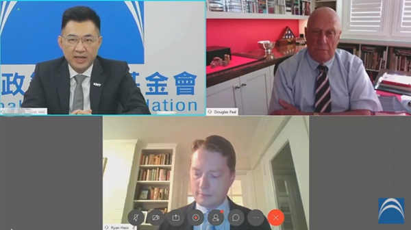 國民黨智庫26日舉辦線上論壇,美國國家安全委員會前中國事務(wù)主任何瑞恩(中下)直言,如果兩岸發(fā)生沖突,多數(shù)美國民眾對派兵參戰(zhàn)持保留態(tài)度。(圖片取自臺媒)