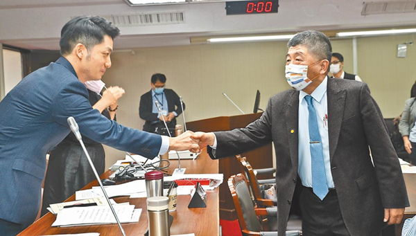 臺(tái)“立法院”12日舉行“開放含萊克多巴胺豬肉進(jìn)口,對(duì)民眾健康之影響與危害”公聽會(huì),會(huì)議結(jié)束后,臺(tái)當(dāng)局“衛(wèi)福部長(zhǎng)”陳時(shí)中(右)趨前向“召委”蔣萬(wàn)安(左)握手致意。(圖片來(lái)源:臺(tái)灣“中時(shí)新聞網(wǎng)”)
