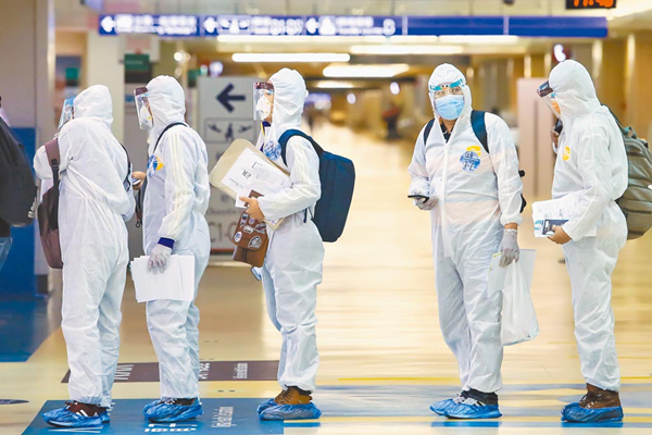 圖為30日旅客全副武裝,做好防護(hù)裝備搭機(jī)返抵桃園機(jī)場。(圖片來源:臺(tái)灣“中時(shí)新聞網(wǎng)”)
