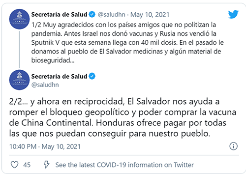 洪都拉斯在推文中稱,將盡可能為人民付出一切購買疫苗,向沒有將疫情政治化的友好國家表示感謝。