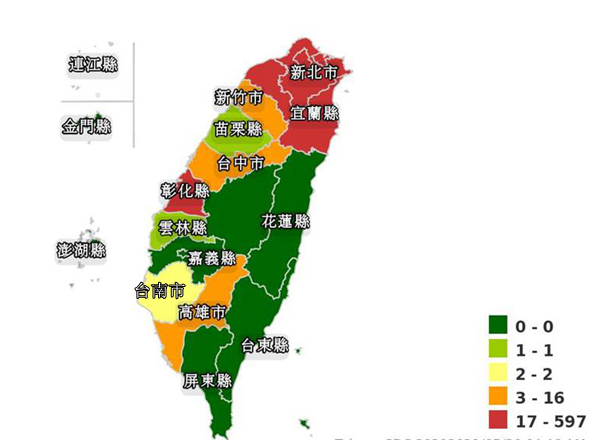根據(jù)臺“疾管署”“全臺本地病例地理分布圖”顯示,從去年1月至今,島內(nèi)累計1329例本地個案,其中以新北市597人最多,接著依序是臺北市526人、桃園市82人、彰化縣58人、宜蘭縣21人、基隆市17人,以上這6個縣市皆是紅色警戒燈號。