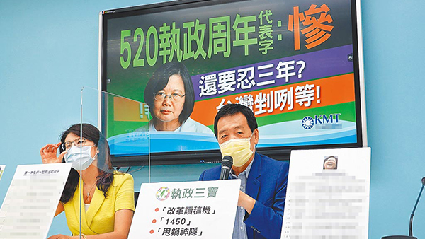 臺(tái)立法機(jī)構(gòu)國民黨黨團(tuán)則以“這一年我們一起熬過的日子”,來形容民進(jìn)黨當(dāng)局連任后首年施政表現(xiàn),書記長(zhǎng)鄭麗文痛批,民進(jìn)黨施政弊端已經(jīng)罄竹難書,臺(tái)灣正處于缺水、缺電、缺疫苗,防疫警戒進(jìn)入第三級(jí),只能用一個(gè)“慘”形容,呼吁蔡英文誠懇地為執(zhí)政不力道歉。
