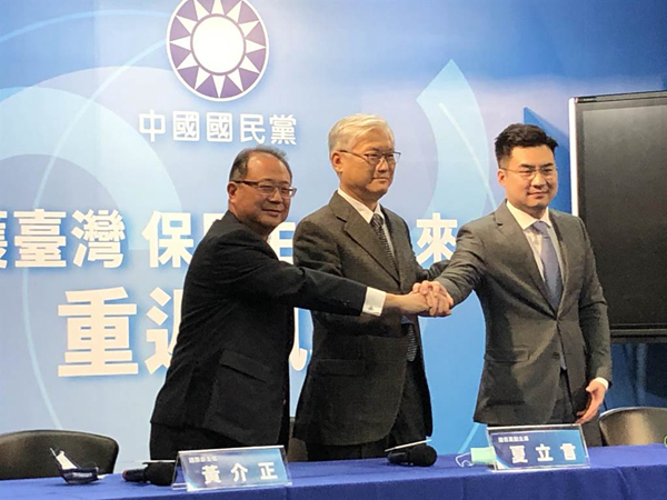 中國(guó)國(guó)民黨副主席夏立言(中)、國(guó)際部主任黃介正(左)、副主任黃裕鈞(右)11月30日下午舉行記者會(huì),說(shuō)明黃裕鈞啟程赴美展開(kāi)駐美代表處籌備工作。(圖片來(lái)源:臺(tái)灣“中時(shí)新聞網(wǎng)”)