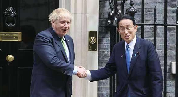 5月5日,日本首相岸田文雄和英國首相約翰遜(左)在會談前握手。(來源:日媒)