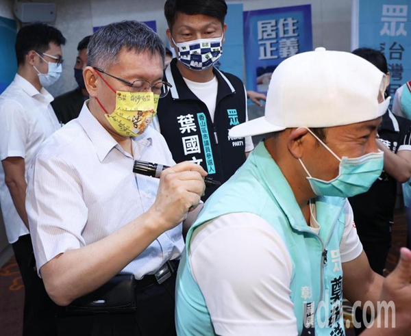 民眾黨主席柯文哲(左)今天帶領(lǐng)提名參選的縣市長(zhǎng)與市議員發(fā)表施政愿景,會(huì)后在許多參選人背后簽名。(圖片來(lái)源:臺(tái)灣《聯(lián)合報(bào)》)