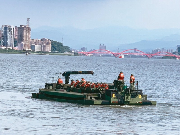 臺(tái)軍“漢光演習(xí)”為防解放軍“斬首”推出所謂新戰(zhàn)法,臺(tái)陸軍把機(jī)動(dòng)浮門(mén)橋車(chē)(圖)變身河防布雷艇,運(yùn)載汽油桶爆擊鏈,模擬阻擋解放軍登陸淡水河口。(圖片來(lái)源:臺(tái)灣《聯(lián)合報(bào)》)