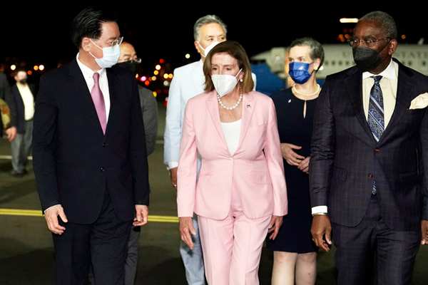 美國(guó)眾議院議長(zhǎng)佩洛西(中)2日晚抵臺(tái)竄訪。