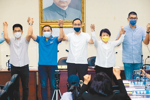 中國國民黨17日舉行中常會,通過提名侯友宜、盧秀燕競選連任新北與臺中市長,黨主席朱立倫(中)牽著新北市長侯友宜(左二)、臺中市長盧秀燕(右二)的手,在中常委的加油聲中高喊“勝利”。(圖片來源:臺灣“中時(shí)新聞網(wǎng)”)