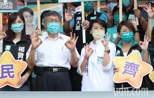 無(wú)黨籍臺(tái)北市長(zhǎng)參選人黃珊珊(右二)今天到選委會(huì)登記參選,民眾黨主席柯文哲(左二)與多位臺(tái)北市議員參選人一起到場(chǎng)力挺。(圖片來(lái)源:臺(tái)灣《聯(lián)合報(bào)》)