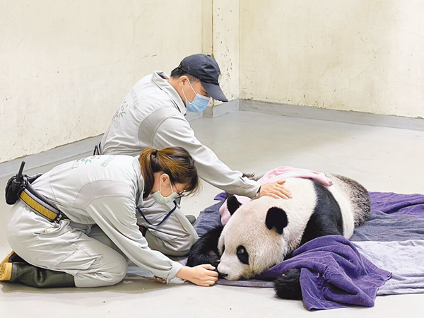 大熊貓“團團”19日下午1時48分心跳停止,赴臺14年歲月正式落幕。圖為工作人員陪伴“團團”。(圖片來源:臺北市動物園)
