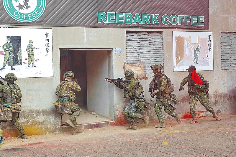 圖為2022年臺(tái)陸軍步訓(xùn)部學(xué)員模擬“城鎮(zhèn)戰(zhàn)”。(圖片來(lái)源:臺(tái)灣“中時(shí)新聞網(wǎng)”)
