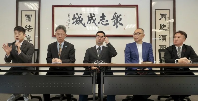 馬英九基金會(huì)執(zhí)行長(zhǎng)蕭旭岑(中)主持記者會(huì),公布藍(lán)白雙方對(duì)2024臺(tái)灣地區(qū)領(lǐng)導(dǎo)人選舉正副人選搭配暫時(shí)“無(wú)共識(shí)”。(圖片來(lái)源:臺(tái)媒)