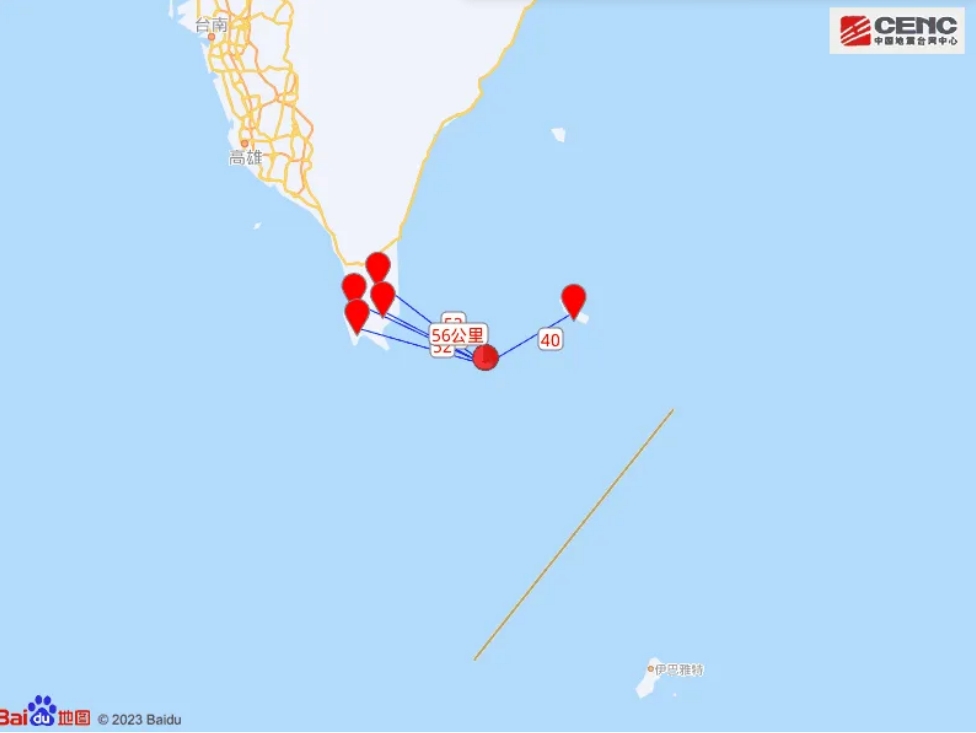 周邊縣城:震中距蘭嶼鄉(xiāng)40公里、距滿州鄉(xiāng)45公里、距恒春鎮(zhèn)52公里、距牡丹鄉(xiāng)53公里、距車城鄉(xiāng)56公里,距臺(tái)東縣100公里,距臺(tái)北市356公里。