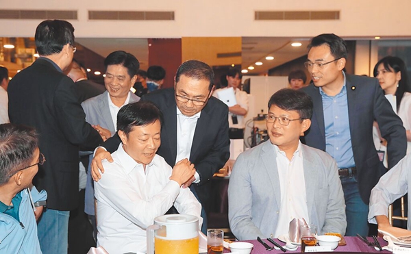 新北市長侯友宜(中)日前邀請新北市區(qū)域與不分區(qū)民代餐敘,拜托協(xié)助新北爭取各項(xiàng)重大建設(shè),民進(jìn)黨民代張宏陸(左三)、民眾黨民代黃國昌(右二)、國民黨民代洪孟楷(右)與新北市副市長劉和然(左)都出席。(圖片來源:臺灣“中時(shí)新聞網(wǎng)”)