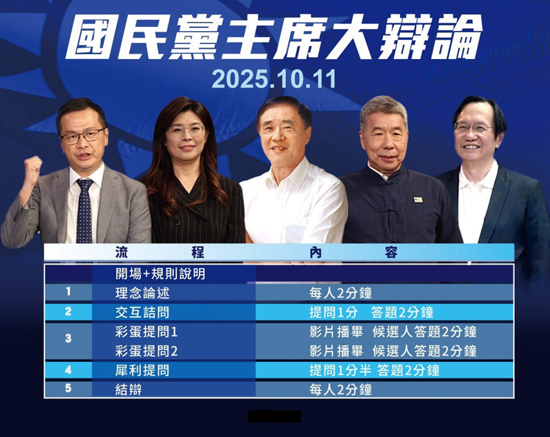 中國臺灣網(wǎng)10月9日訊 據(jù)臺媒“中時新聞網(wǎng)”報道,中國國民黨主席選舉投票前最后一場辯論會,將在10月11日星期六下午2點舉行。