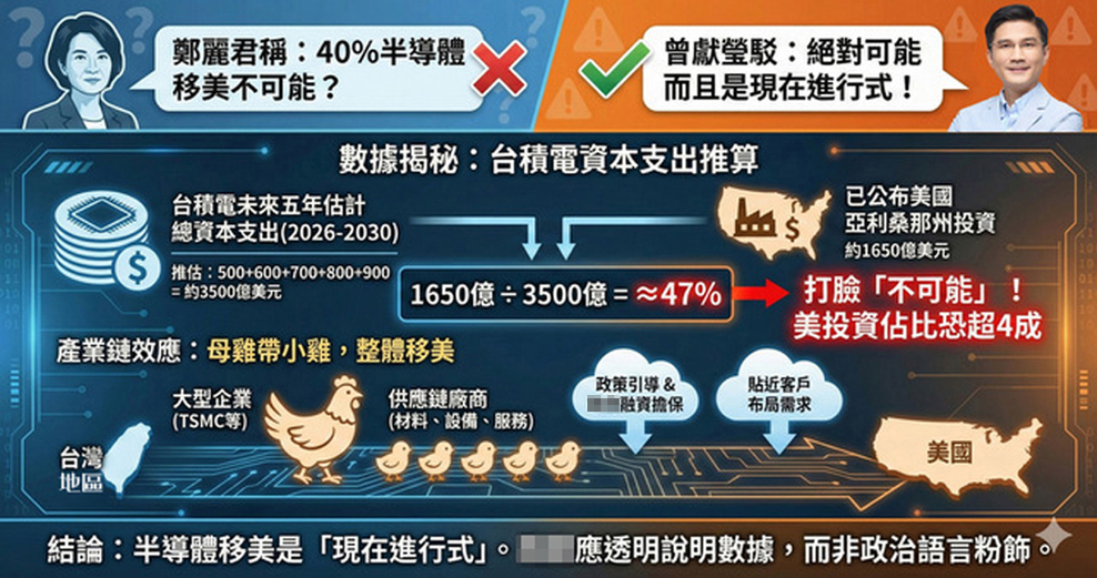 曾獻(xiàn)瑩指出,這直接打臉鄭麗君所說(shuō)的“不可能”!臺(tái)灣40%先進(jìn)半導(dǎo)體產(chǎn)能移美絕對(duì)可能,而且是現(xiàn)在進(jìn)行式!他表示,日前公布的臺(tái)灣地區(qū)對(duì)美關(guān)稅談判內(nèi)容中,涉及約5000億對(duì)美投資,其中約2500億由企業(yè)自行出資,另外約2500億由臺(tái)當(dāng)局提供融資與信用擔(dān)保。上述情況勢(shì)必導(dǎo)致半導(dǎo)體產(chǎn)業(yè)出現(xiàn)“母雞帶小雞”(出走)效應(yīng),臺(tái)灣未來(lái)5年整體產(chǎn)業(yè)鏈勢(shì)必將移向美國(guó)。