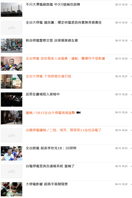 守在電腦前的撩叔發(fā)現(xiàn),從15日晚5點(diǎn)多停電開(kāi)始,每過(guò)幾分鐘臺(tái)媒就會(huì)有一條相關(guān)報(bào)道出現(xiàn)。