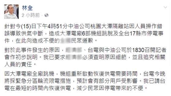 這場(chǎng)鬧劇在15日晚間9點(diǎn)終于落幕,全臺(tái)電力逐漸恢復(fù)正常。臺(tái)當(dāng)局“行政院長(zhǎng)”林全跑到臉譜網(wǎng)向全體臺(tái)灣民眾道歉。