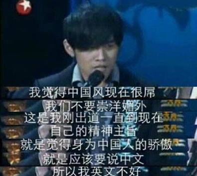 比如,2008年11月風(fēng)尚大典時,主持人曾寶儀提到讓在韓國人氣很高的周杰倫用韓語感謝韓國歌迷時,他說:中國風(fēng)很屌,大家都要來學(xué)中文,我們不要崇洋媚外,這是我剛出道一直到現(xiàn)在的宗旨。