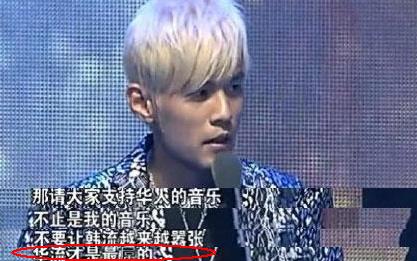 再比如,周杰倫在2012年4月全球華語榜中榜頒獎典禮上領(lǐng)獎時說“希望所有的歌手可以團結(jié)起來,因為華人的音樂是最屌的”;同年12月的百度沸點慶典上,狂攬3項年度大獎的周董依舊不改力挺民族文化的本色,公開“叫囂”韓流:“不要讓韓流越來越囂張,華流才是最屌的。”