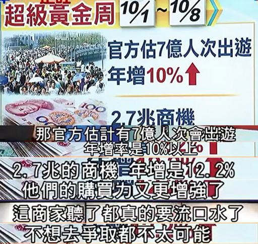 今年,大陸約會(huì)有7億人次會(huì)出游且大概會(huì)創(chuàng)造出2.7兆(臺(tái)灣方面所使用的“兆”為1萬億新臺(tái)幣)的十一“超級(jí)黃金周”,臺(tái)媒羨慕的表示,如此商機(jī)真是令不少臺(tái)灣觀光業(yè)的商家都垂涎。