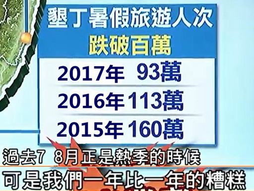 以墾丁為例,其原本是“暑期游”的大熱之地,可是近兩年的情況一年比一年糟糕,今年的暑期旅游人次更是跌破了百萬大關(guān)。