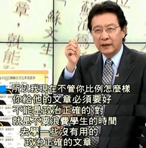 對(duì)此,有臺(tái)媒人士也向蔡當(dāng)局喊話:不管最后定的比例怎樣,你給學(xué)生的文章必須要好,而不是所謂的是“政治正確”的文章!