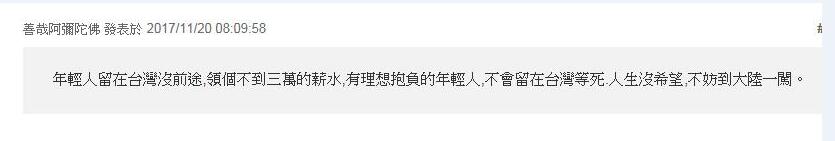 臺灣網(wǎng)友也給出了解釋,臺灣被“空心菜”搞得虛無縹緲,大陸卻是一片熱火朝天:“綠營”為私欲而搞“本土化”,結(jié)果令臺灣優(yōu)勢盡失,經(jīng)濟(jì)嚴(yán)重下滑,找工作也越來越難,有理想有抱負(fù)的臺灣青年與其在臺灣“等死”,不如到大陸求發(fā)展。