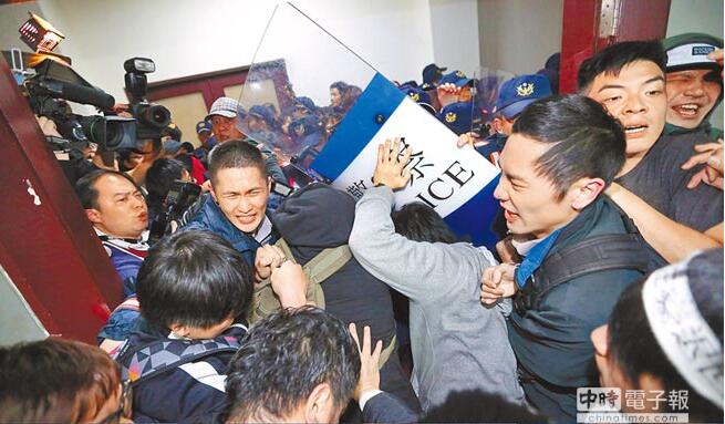圖為反服貿(mào)學(xué)生沖入“行政院”辦公室內(nèi),與衛(wèi)警發(fā)生嚴(yán)重推擠的畫面。(圖片來源:臺灣《中時電子報》)