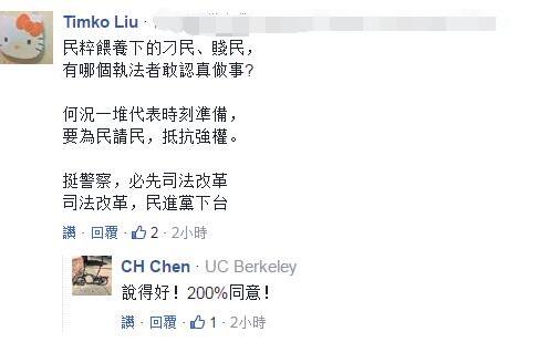 對此,也有臺灣網(wǎng)友發(fā)表了自己的看法:挺警察,必先“司法改革”;若想“司法改革”,民進(jìn)黨就得下臺!