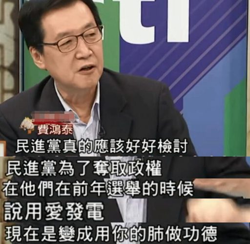 知名政論評論人費鴻泰也表示,民進黨真的應該好好檢討下,選舉時說好的“用愛發(fā)電”,如今卻變成“用肺做功德”。