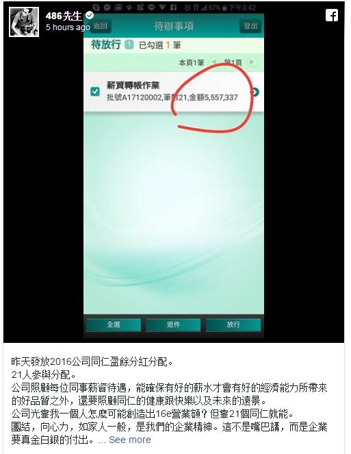 “486先生”28日在臉譜網(wǎng)的粉絲團(tuán)上曬出了2016年總共555萬7337元的“同仁盈余分紅”,讓21位員工共同分配,他表示,“公司光靠我一個人怎么可能創(chuàng)造出16e(億)營業(yè)額?但靠21個同仁就能”、“團(tuán)結(jié),向心力,如家人一般,是我們的企業(yè)精神。這不是嘴巴講,而是企業(yè)要真金白銀的付出”。此外,“486先生”也透露,平時就會保障公司每位同仁的薪資待遇,更表示好的經(jīng)濟(jì)能力除了可以帶來良好的品質(zhì),還可以為同仁帶來健康、快樂,讓他們充滿對未來的遠(yuǎn)景。
